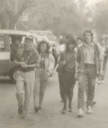 | Лучший друг Леши Вдовина и вообще хороший человек Валерка Шаповалов шествует рядом с Ленкой Ким и Славой Задерием, основателем группы "Алиса". 1989 год. |